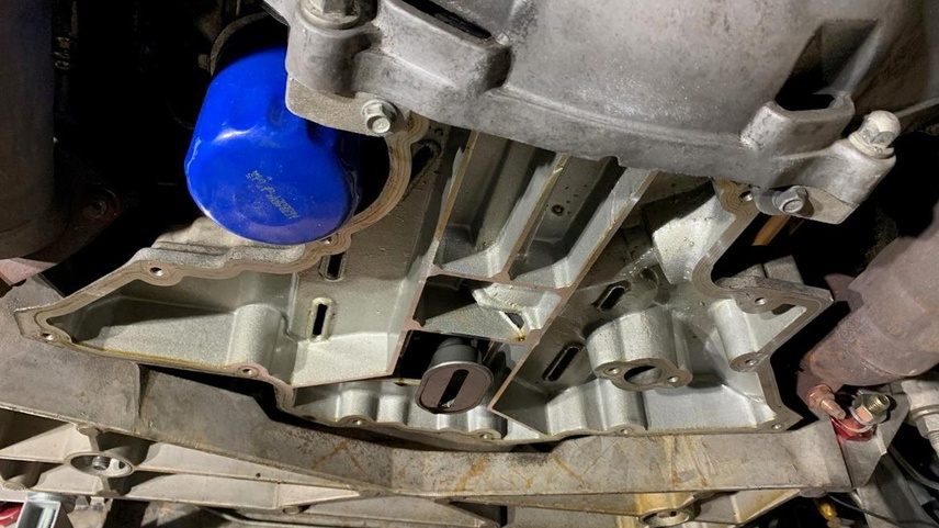 We install a new oil pan baffle to combat oil starvation.