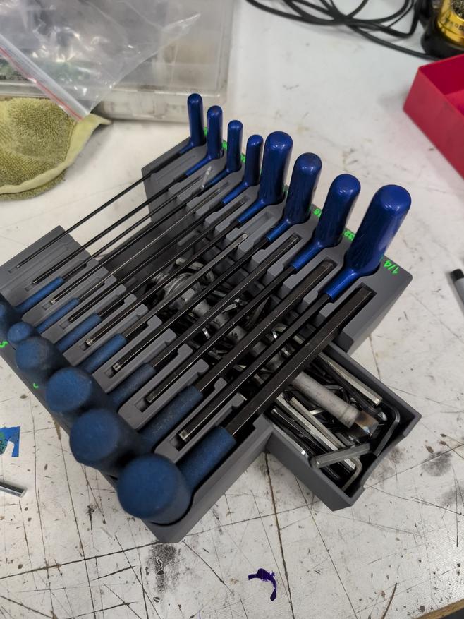 The challenge with T-handles is for efficient storage they need to be vertical. Here's a combo inch/metric holder with a slide tray for the loose L-wrenches or combo sets. ![]()