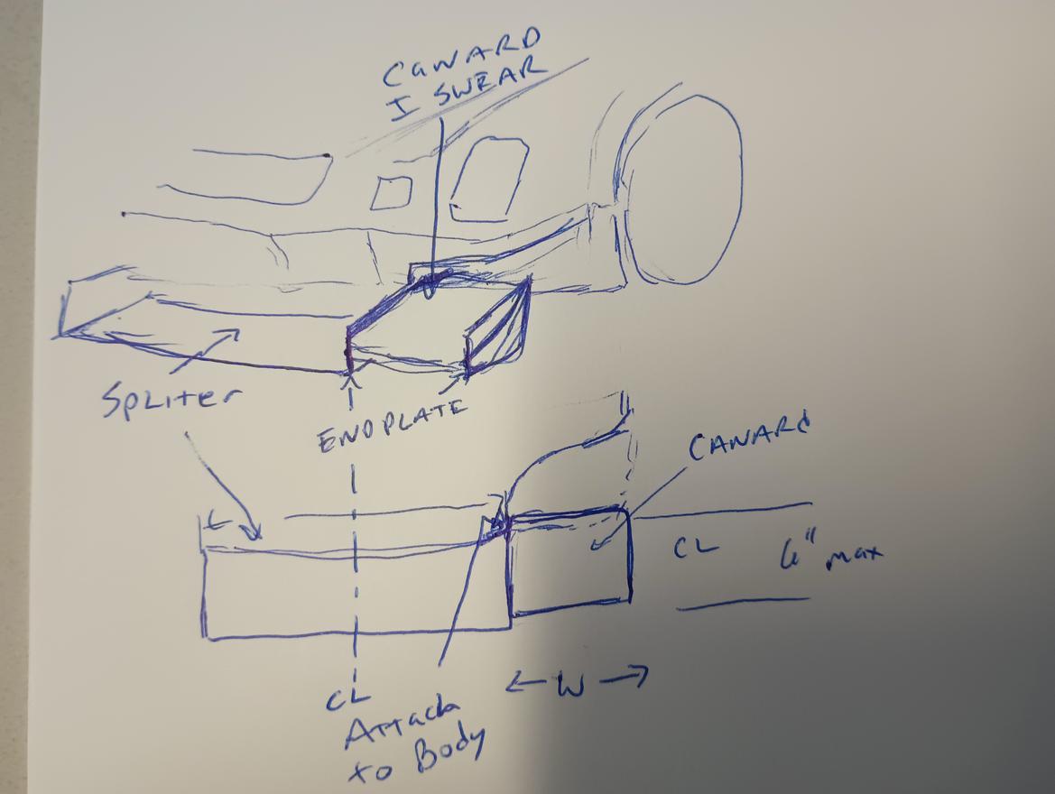 So why not narrow your splitter and attach your canard outboard of it's endplate. You would then mount the canard very low on the car because.. well it's a wing. But you would only ever call it a canard and refer to it as such. Have some portion of one edge actually attach to bodywork so it would be a "Canard".