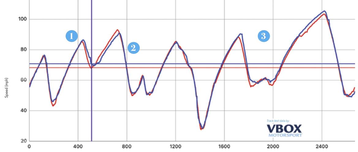 The street-focused StopTech brake pads don’t feel up to the rest of the car’s capabilities, but the data traces looked surprisingly good. Later, we found an issue with the car’s ABS unit, but again, just looking at the data, we might not have caught it.