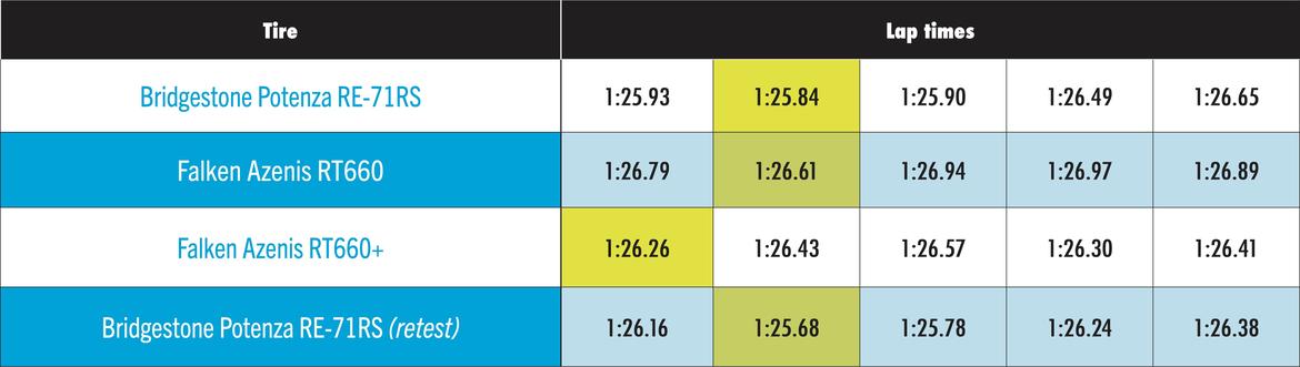 Lap times are not the issue with the Falken, its the center rub falling off after 3 laps. If that didn't happen, they are an improvement over the old. They burned me twice with poor quality, it will take more data to convince me to try them again.