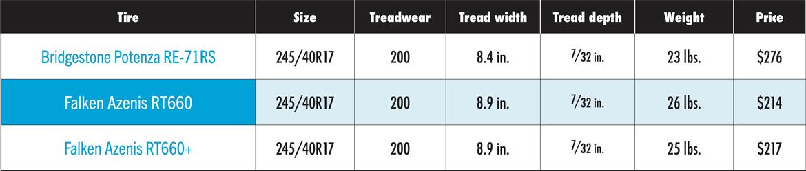 How much better is the new version? Falken sent us a set of both the outgoing and incoming models to compare. To complete the test suite, we added a set of the Bridgestone Potenza RE-71RS as our benchmark–this particular set a veteran of two previous tests, now worn to a 6/32 tread depth. All of our 245/40R17-sized test tires were mounted on 17x9-inch 6UL wheels by 949 Racing.
