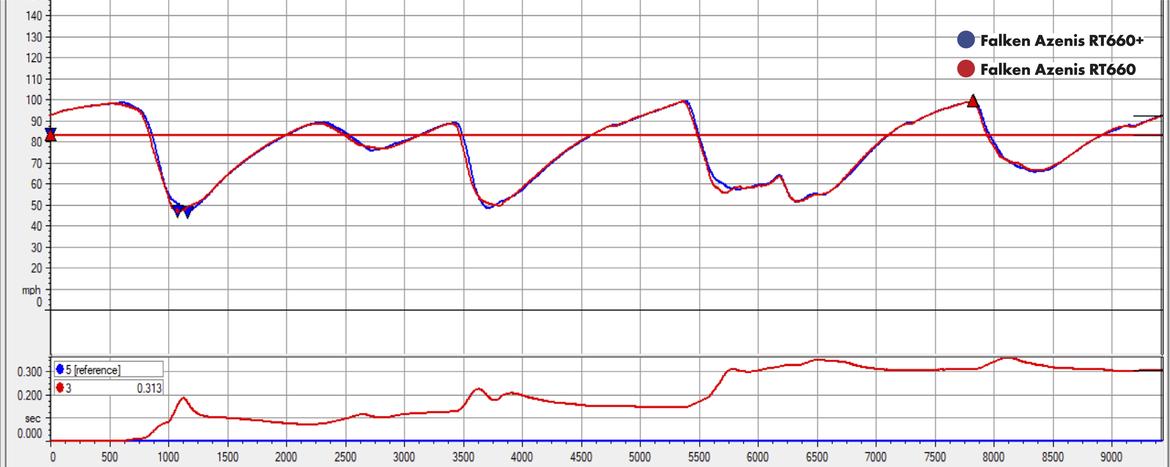 One key feature of the RT660+ update is the ability to brake later, especially under trailing conditions, yet still hit the apex. In this comparison of the speed traces between the two tires, notice how the cumulative time delta line bumps up during each braking event.