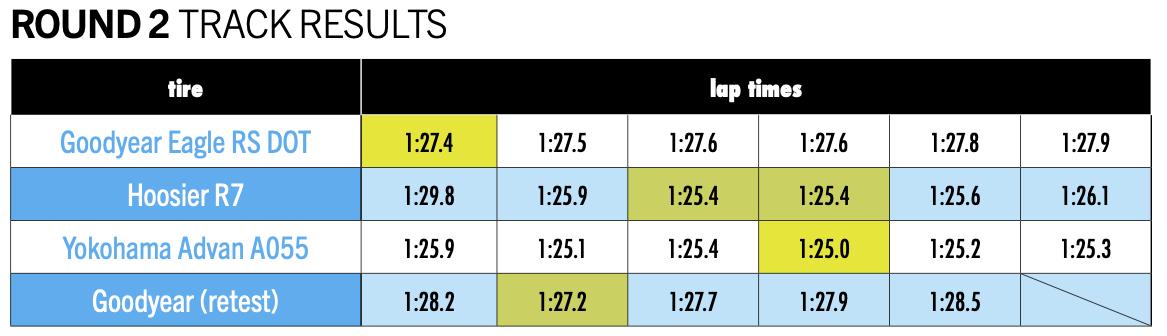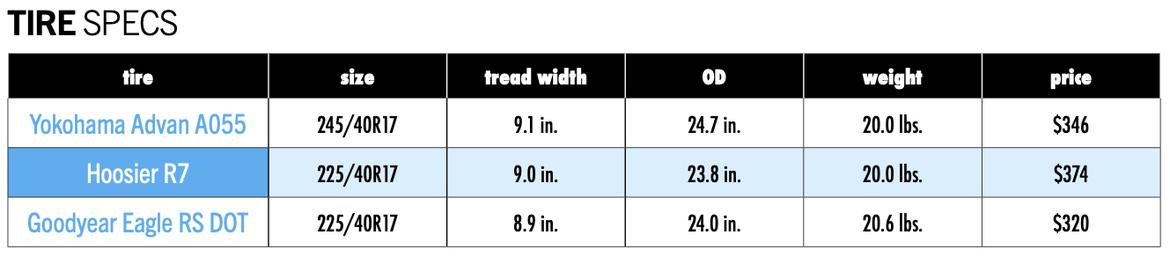 We also changed the relative sizing used for this test. Both the Hoosier R7 and the Goodyear Eagle RS DOT are physically large for their marked size, while the Yokohama Advan A055 better aligns with the industry’s standard dimensions. By using tires all marked with the same size, last year’s results likely penalized the narrow Yokohama.