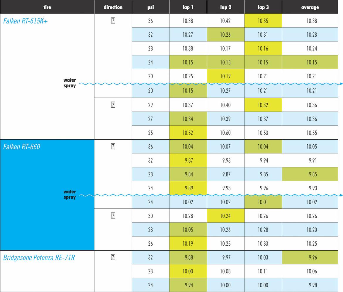 Staying with the Falken brand, we bolted up the RT-660. This tire delivered a similar overall feel to its predecessor, but with way more grip. Likewise, lowering pressures increased slip angles as the car leaned more, producing more lateral g-loads and quicker times. Spraying this tire had no discernable effect, though, even as optimal pressures were once again confirmed at 28 psi. The big story was the solid three-tenths improvement in lap times on a 10-second lap.