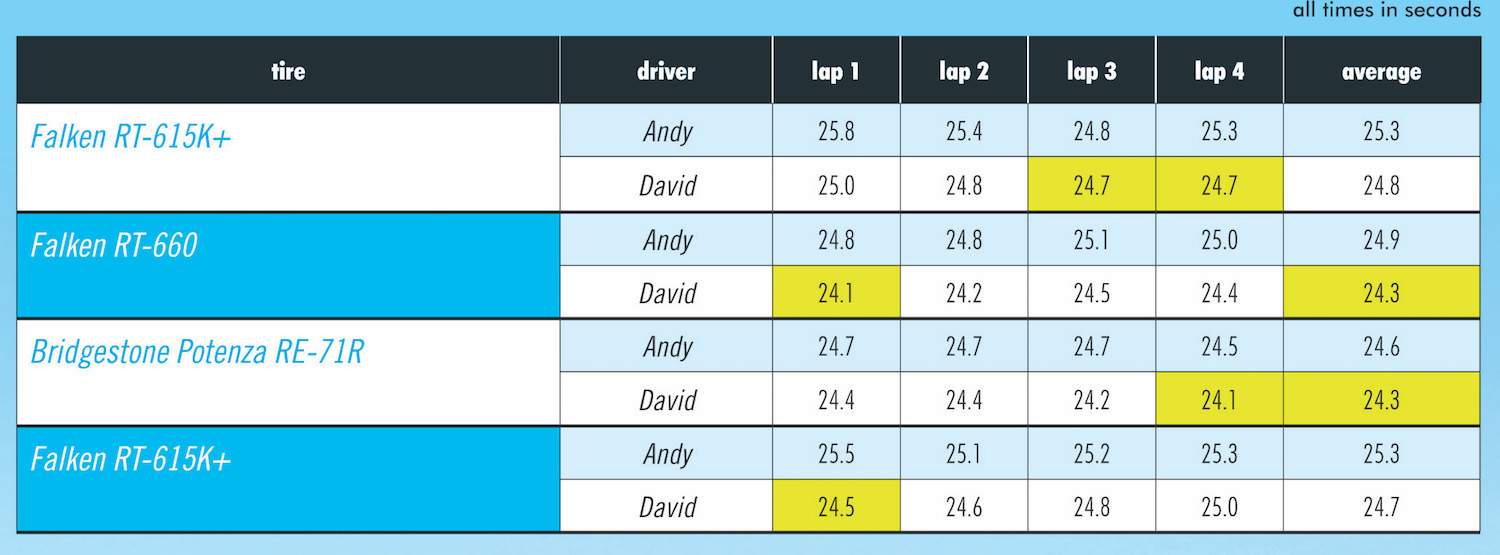With the benchmark Bridgestone RE-71R in place, Andy continued to find time. “Love these tires. Very intuitive. Incredible slalom response.” David matched his RT-660 times, noting a decrease in sweeper grip balanced by quicker transitional performance: “Very confidence-inspiring.”