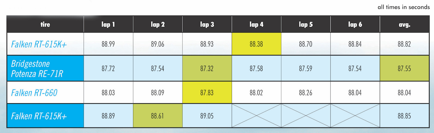 Next was our benchmark, the Bridgestone RE-71R. In past tests, we’ve found this tire to be fairly pressure-agnostic, centering around 28 psi as optimal and delivering crisp response at small slip angles throughout. Given that, we only did three rounds of laps in one direction to get relative steady-state lap times to compare to the RT-660. That result? The newcomer from Falken was a touch quicker.