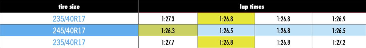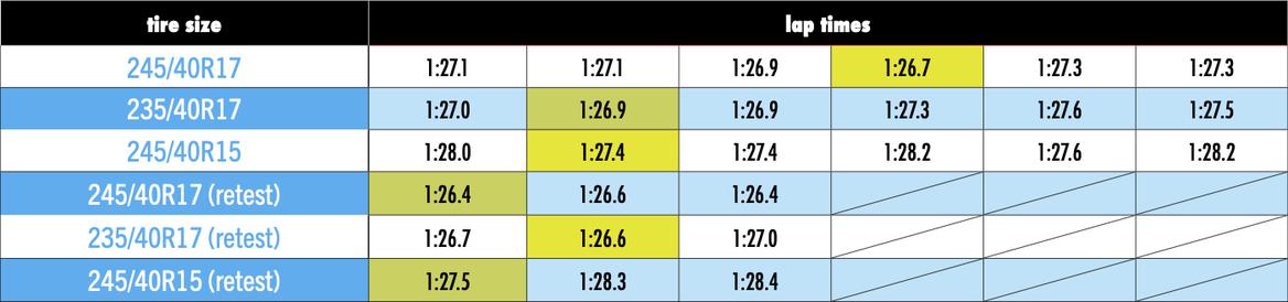Faced with the specter of flawed data from track evolution and driver improvement, we kept the test rotation going by again mounting up the 235/40R17s. They also picked up time over their previous iteration with a best lap of 1:26.6, but they remained the same two-tenths slower than the 245s in the back-to-back sessions. This confirmed our comparison of those two tires.