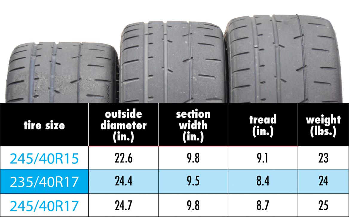 The other new size that looked enticing was a 245/40R15, which would deliver an even shorter, lighter tire. If some is good, more is better, right?