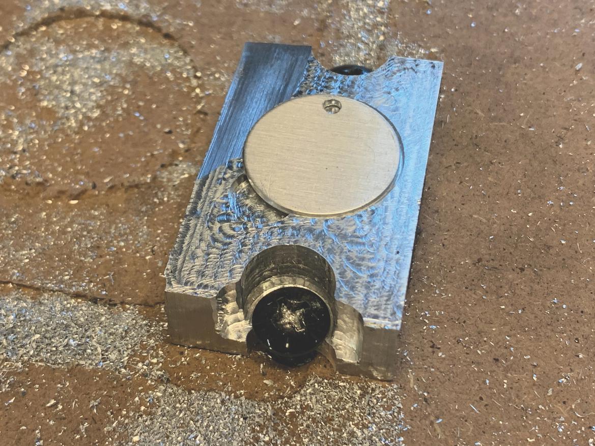 Emboldened, we decided to get fancy. Could the 3018 create complex three-dimensional parts out of aluminum? We fitted a 4mm router bit, clamped down a tiny block of 6061 aluminum, and had our answer a few hours later. The 3018 carved a custom-made keychain fixture, our overengineered solution to holding down each keychain for engraving. We were officially CNC machining aluminum parts.