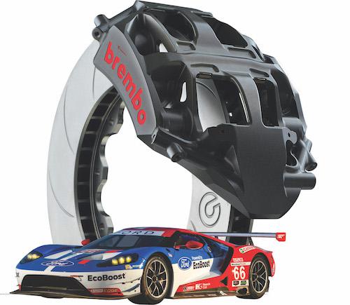 Brake photograph courtesy Brembo, GT race rar photograph courtesy Ford