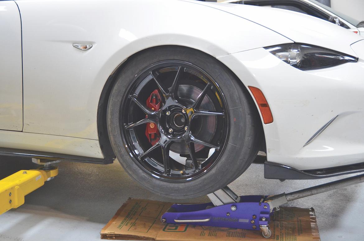 To measure how much spacer our bump stops needed, we first measured travel with our tires and Flyin’ Miata Kogeki wheels in place. Photography Credit: Andy Hollis