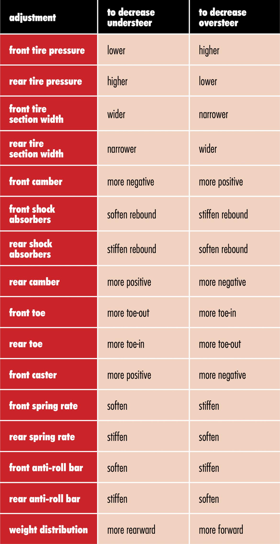 This is one of the best documents I have ever seen for car setup tweaking. Great job pulling all this together in an easy to digest format. Need to print that out and keep it with the track clipboard for easy reference.