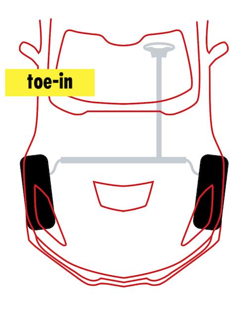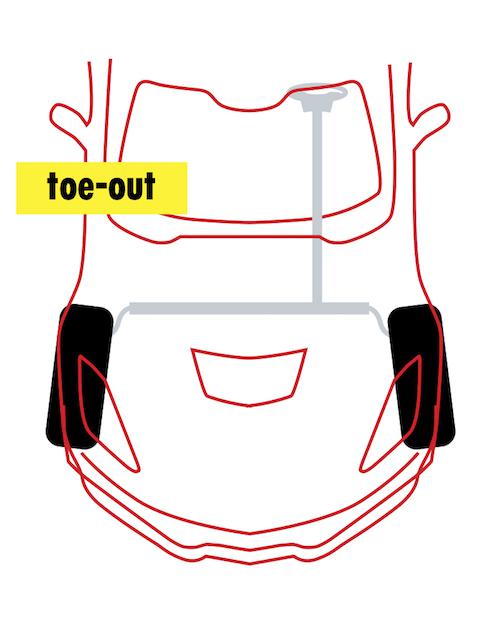 Goal: A bit of toe-out up front can help with turn-in. Too much toe-out, though, can lead to instability, especially under braking.