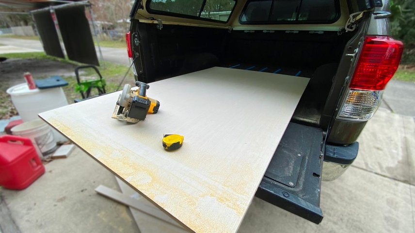 We build an inexpensive truck bed cargo slide so we can easily reach items in the back of the truck bed.