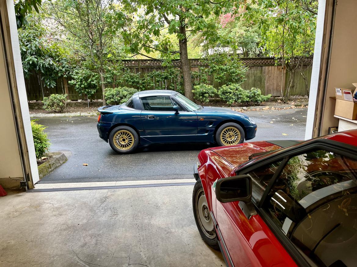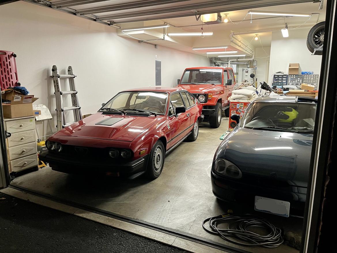 Might be the angle. The garage felt huge when I moved in, but now I've got it pretty packed. Here's the view looking into the garage. If I cut the wheel on either the Cappo or the Alfa, there's space to pull out through the door. If I park both of them within 6-8 inches of the wall/stuff piled along the wall, there's just room to swing the driver door fully open on one of the two at a time into the aisle between the two. There's four bikes stacked tightly behind the Cappuccino, which can thread the needle out between the cars to go on a ride. Behind the bikes is a workbench with just enough room to stand right in front of the bench. Behind the Land Cruiser is the parts washer, milling machine, and storage cabinet. The second tool box, lathe, and parts storage shelving are just out of sight along the wall opposite the back of the Land Cruiser and the hot water heater.
