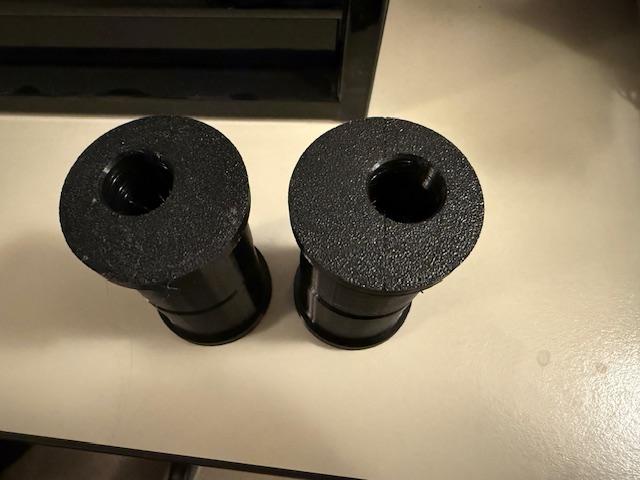It went from the engine mounts being too spread out to too close together. I must have mis-measured or miscalculated something. There really isn't enough meat on the frame mounts to grind them out, and I really don't want to cut, grind, and reweld the mounts. I'd be afraid I'd end up messing something else up in the process. Standing around staring at it, and debating if I could just stack a bunch of washers to get it to line up, it hit me. I could just make offset bushings. Its about 7/16" too wide, so if I make a set of bushings each offset by about half that, they should fit perfectly. I'll want to mess with the print settings a bit, to make sure the inner and outer walls have at least a bit of infill, so there is some give on all sides. Thinning the walls down, and increasing the infill density should do the trick, and not cause problems. Since this means the store bought bushings won't work as a substitute, these mounts will get a heat shield to protect them from the headers.