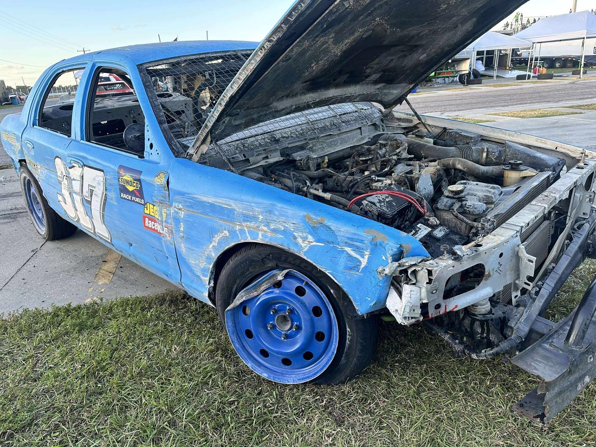 So on top of the E36 M3ty miata news, the Crown Vic took a pretty hard hit on Saturday night. I had offered it to Britt to drive again to try for redemption after the last outing. Somehow things went even worse! He got pinched up into the wall on lap 1. :(