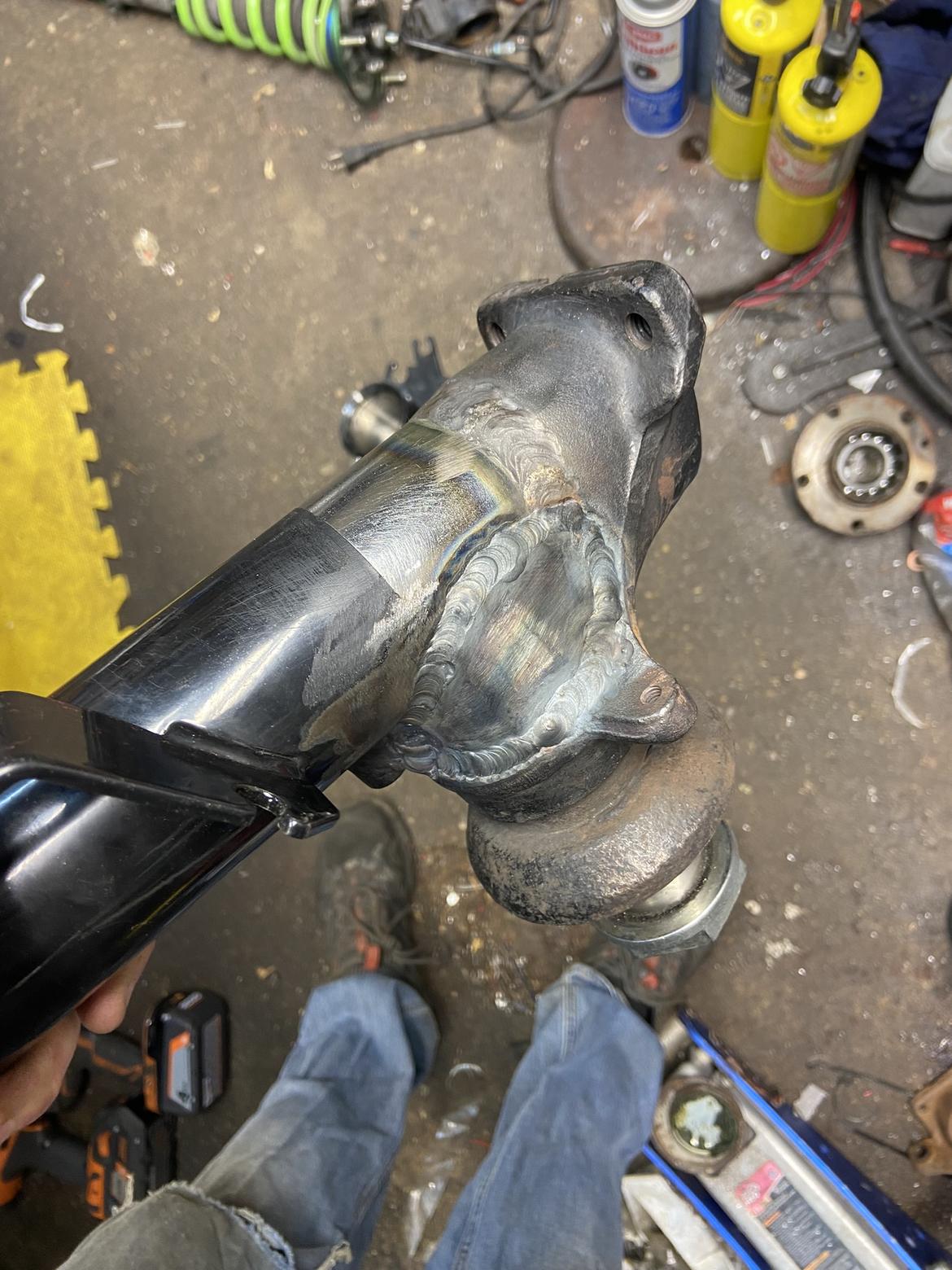 So welded those back up, aligned as well as I could do it. I certainly don't trust my welding as much as Brian's but mitigated that by adding a full sleeve that goes 3-4" above and below the connecting weld (some DOM tubing, which I had to slightly split to get it on over the threads). So this should actually be substantially stronger than the way it was done before, and also takes the weaker OEM section out of the concern. It's not pretty, but it'll do.