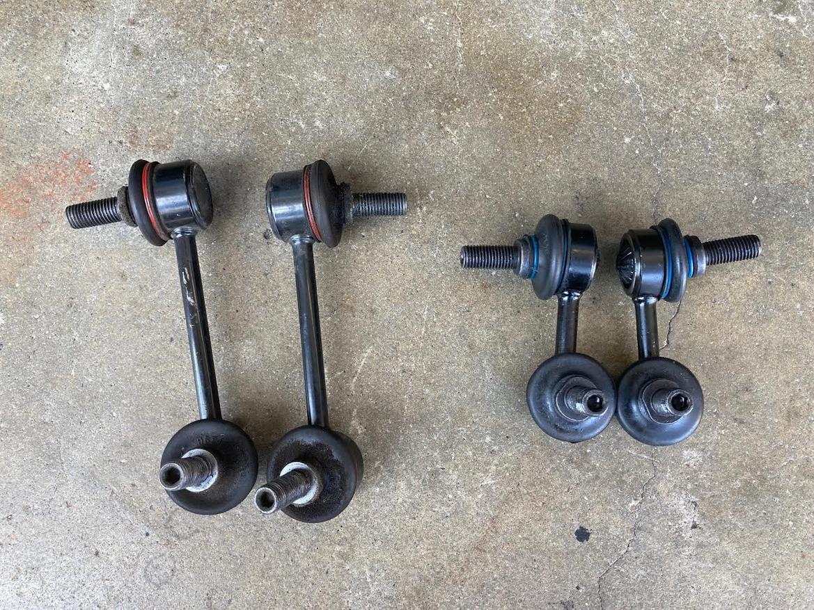 In other news, the rear swaybar is still hitting the subframe. There are a new set of witness marks near the old ones. To take another stab at solving the problem, here are a set of rear links from a 2005 Acura RSX (with NB Miata on the left):