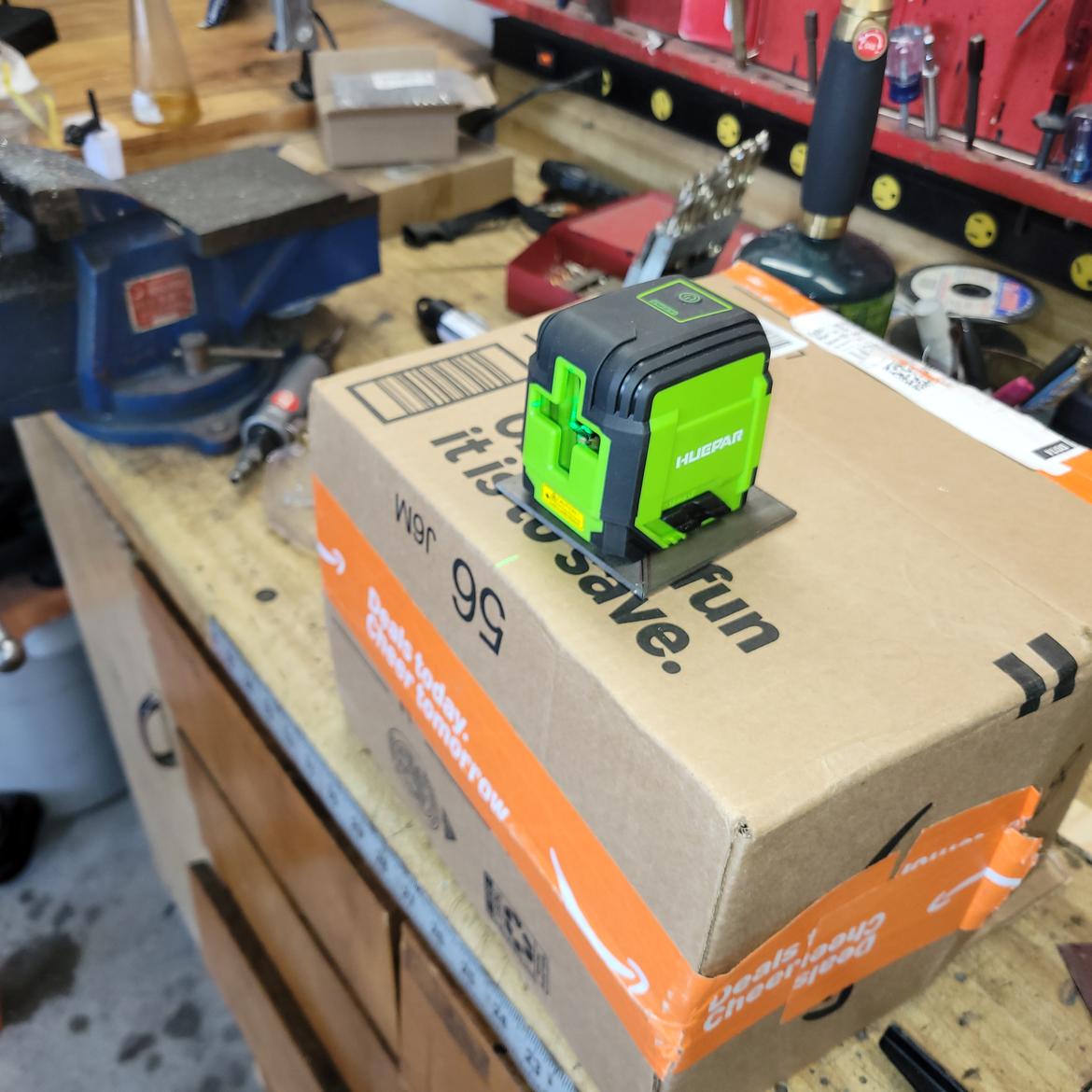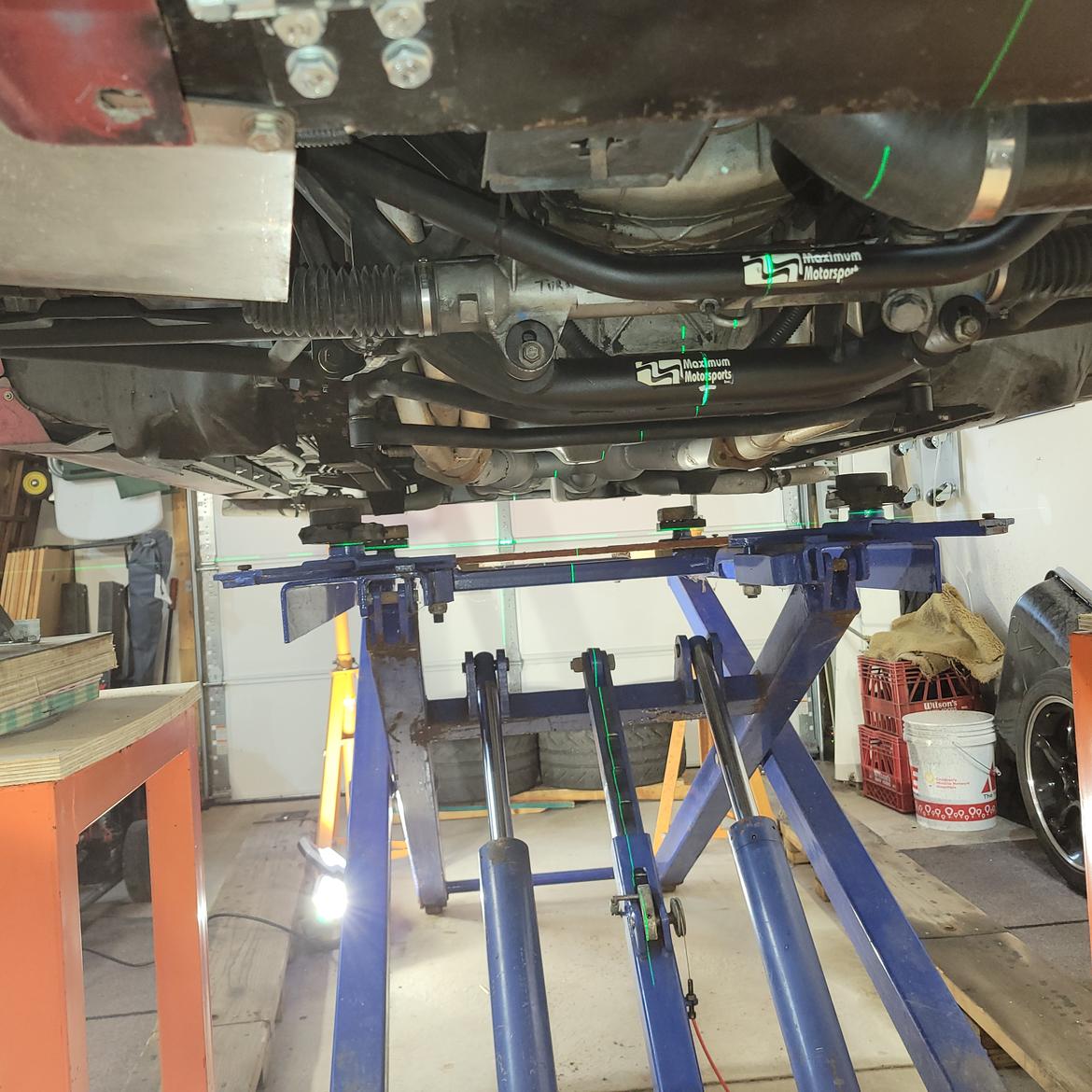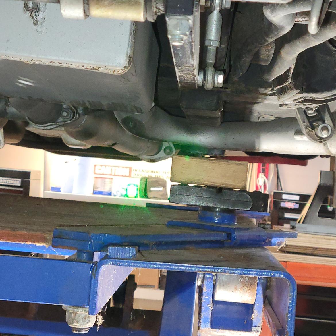 Look closely and you can see the green laser on the paint mark at the K-member running all the way to the cross hair on the garage door.