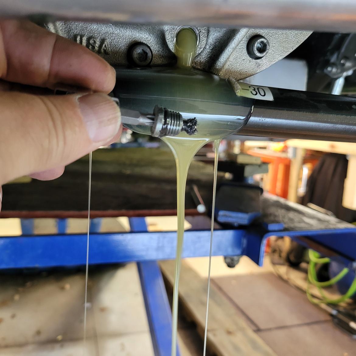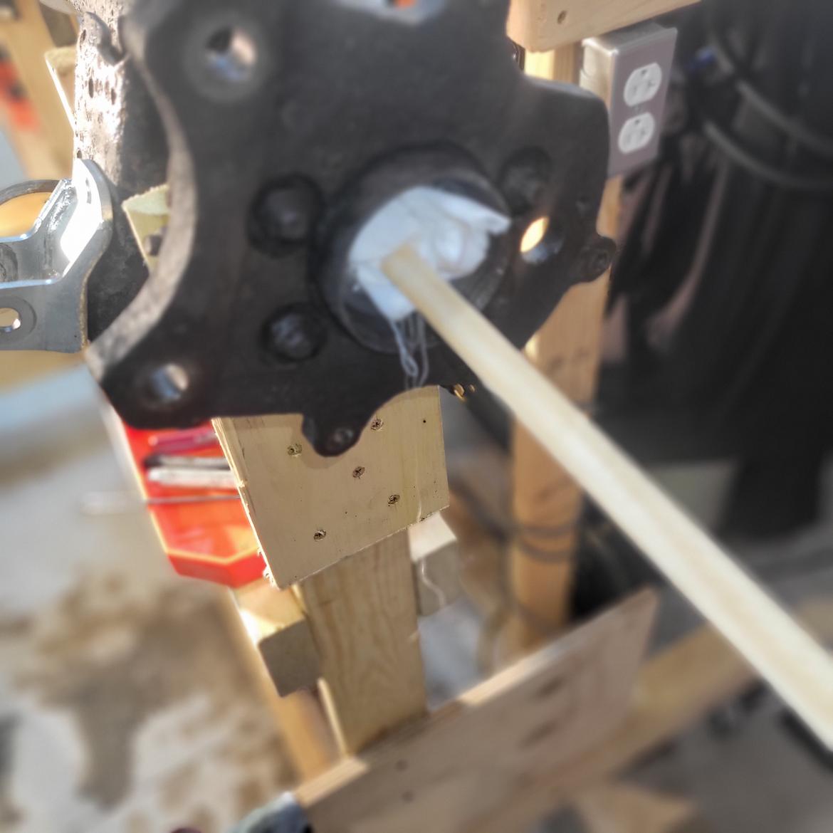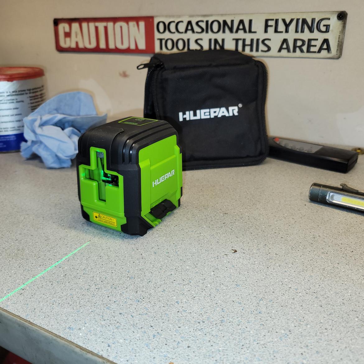 Look closely and you can see the green laser on the paint mark at the K-member running all the way to the cross hair on the garage door.