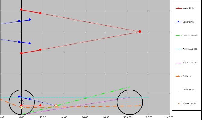 Note that the green diamond showing where the force vector from the rear tires (as filtered through the suspension) intersects the vector pointing up from the front spring is about 160% of the elevation of the CG. So this suspension (as found) jacks up the rear of the car on acceleration. Great for drag racers.