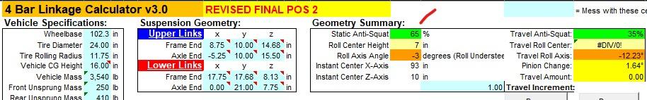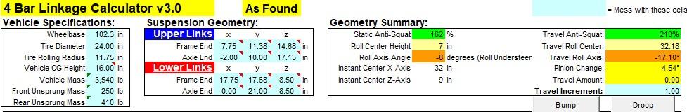 The big surprise was the 162% calculated anti-squat in the center green cell on the top image. That is what you might set up for a drag car.