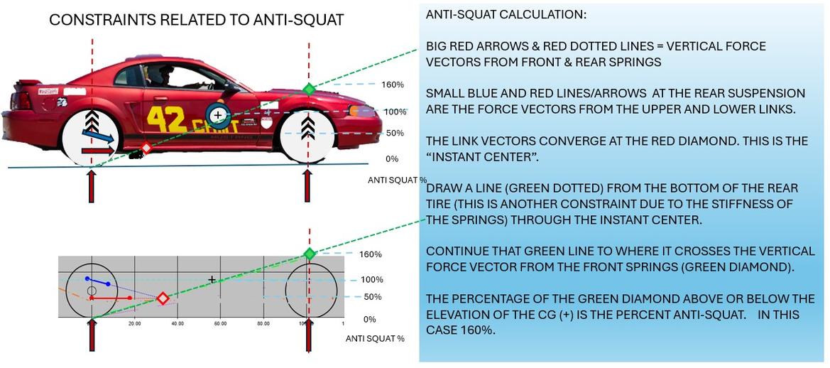 The actual geometry of how the rear suspension behaves under acceleration is below. This is the same chart from the spreadsheet (above) annotated to show what the anti-squat calculation is doing. Follow through the steps on the right and keep in mind the floating car discussion.