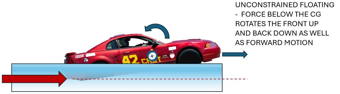 If I push the car forward down low from the back in a horizontal line (where the axle would be) you can imagine it tipping up in the front and down in the back as it accelerates (like a normal small boat with an outboard motor). This is because the thrust vector (red dotted line below) is aimed below the CG.