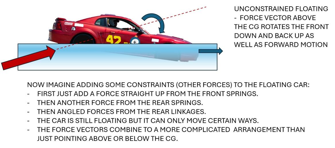 The above is over simplified but not a bad analogy. Your car IS sort of floating on its springs but its rocking motions are “constrained” by suspension linkages connecting it to the ground.