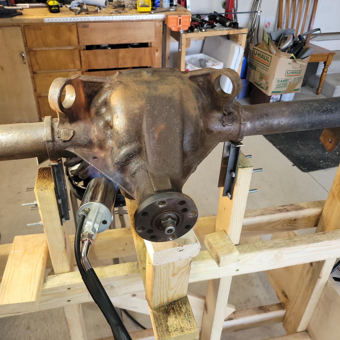 For the rear I used a historical weight of 160 pounds for the axle assembly, added the brakes tires etc. and came to a total of 410 pounds. Regretfully I forgot to check this when the axle was off the car (sigh).