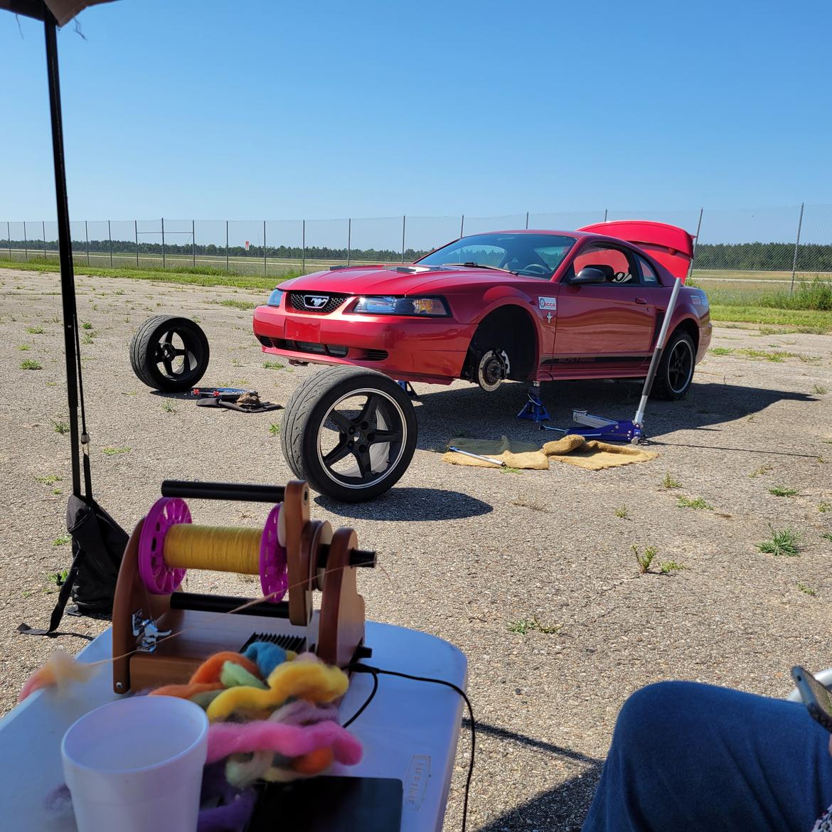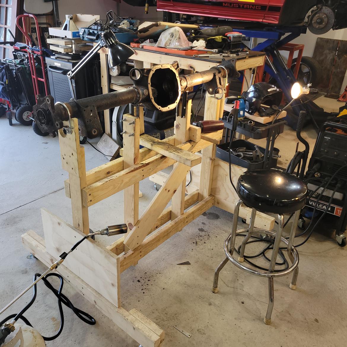 The front was sitting on the support frames and alignment stands I made some years ago. The axle was on the shortened HF stands also from some years ago. Car is supported on its suspension and dead level (as measured from the wheel centers to the laser beam). In my case I was able to set the LASER exactly at the elevation the ground would be including tire deflection. If the exact elevation can’t be set then you can just do math and add or subtract the difference.