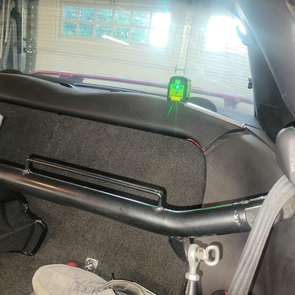 I finally got a bead on things by using the laser level mounted on the rear deck aimed at the center of the steering wheel and aligned parallel with the rocker panels.