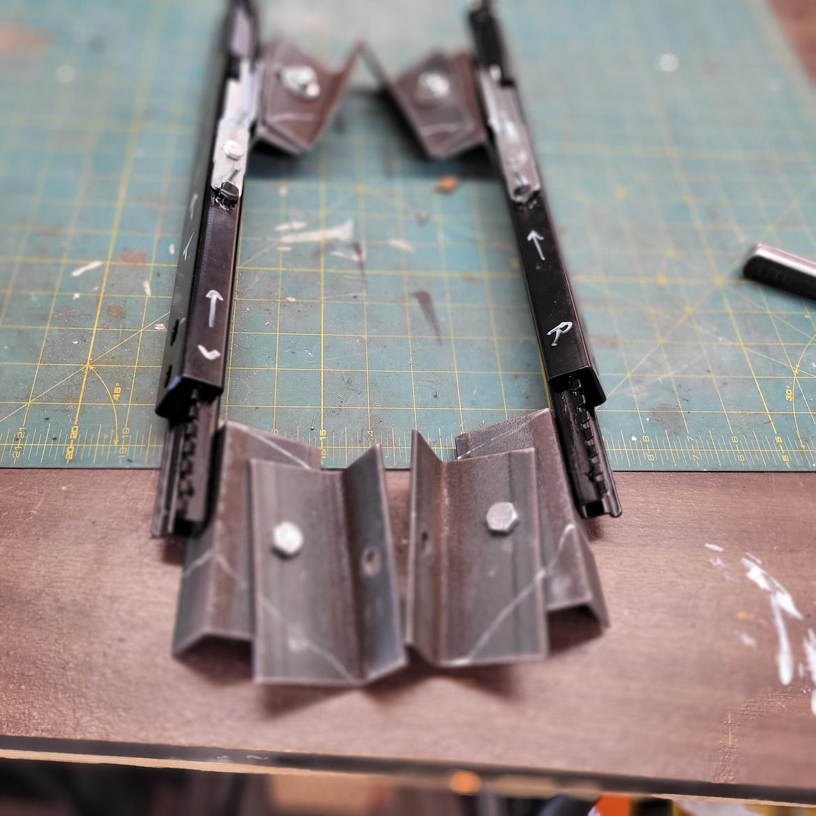 The seat sliders needed to be adapted to the aluminum seat brackets from Kirkey. This entailed a couple of ½” square steel tubes welded to some strip steel. This frame would tie the whole assembly together above and below.