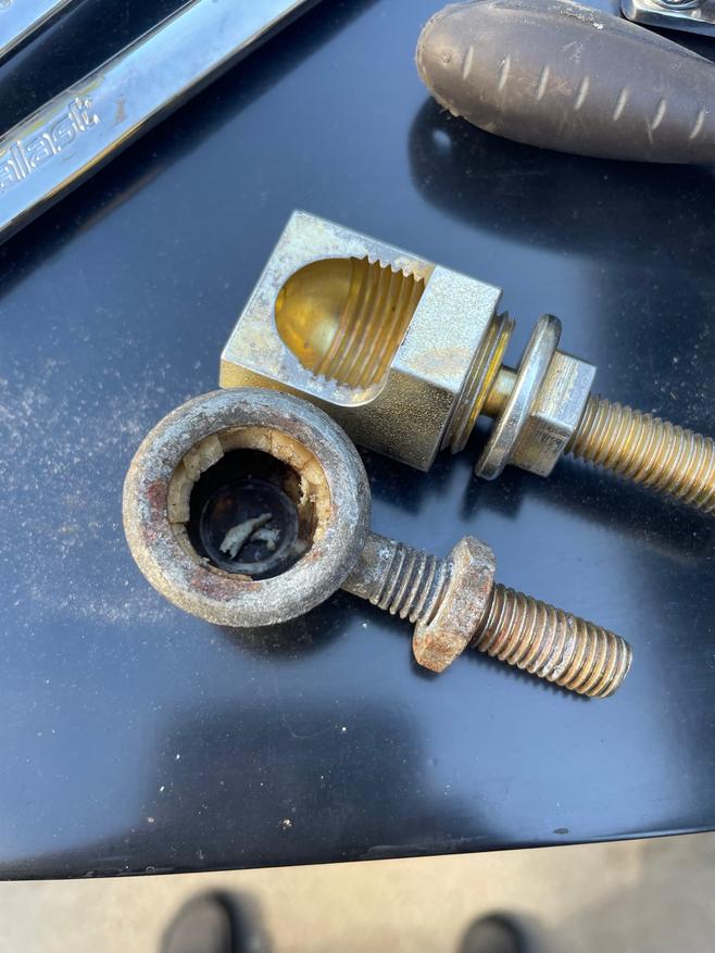So here's the issue. Stock ball socket has a plastic bushing that squishes a tiny bit so you screw the end into the shift linkage bar, then squeeze it onto the ball. Easy. Pictured next to the new adjustable all-steel one.