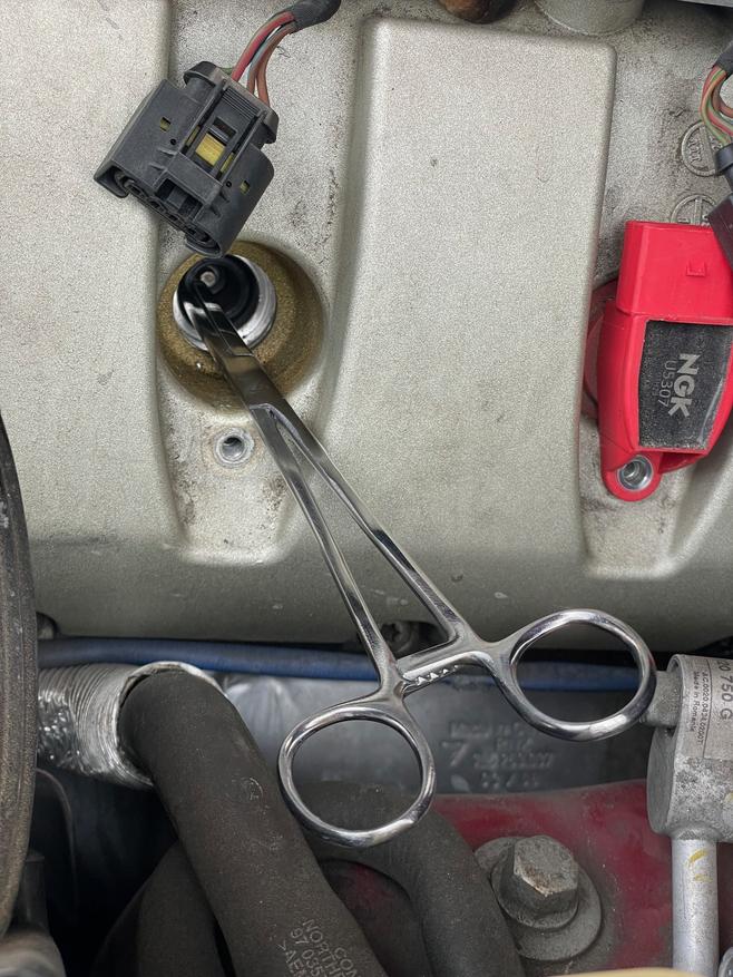 If you're wondering what that picture is, I'll explain. When I pulled the coil pack off, the last part of it decided to stay on the spark plug. Basically a stiff rubber boot that goes around the plug. And a spring. A little magnet got the spring out, but then I needed to remove the rubber boot thing. That proved to be a problem, as it's way down at the base of the plug, where the socket would go. And it's really on there. This is/was my only running car so I walked down to the local hardware store, maybe 0.5-0.75 mile away, looking for something to help. They don't have any of those super long reach needle nose pliers, the ones with two joints. But, they had medical forceps. So I bought those and a pair of regular needle noses, as I couldn't find mine. Walked back to the car.