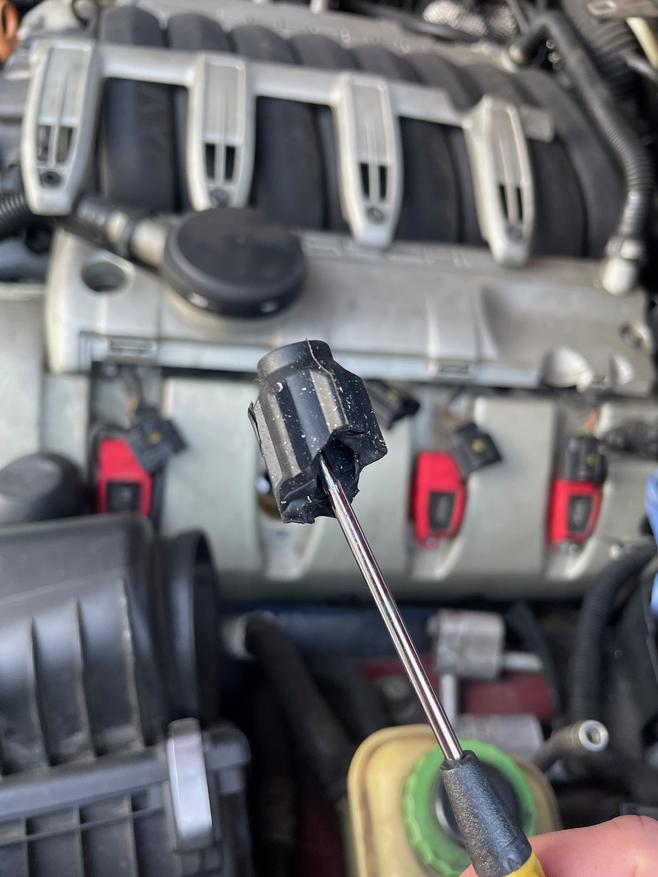 What you're looking at is the coil pack without the rubber boot. Once again, it was stuck down around the spark plug. I cursed pretty loudly at that. I've never heard of this happening to others, and a quick google search showed me nothing. At least now I was experienced and knew the best way to get the stupid rubber pieces out.