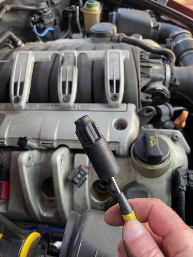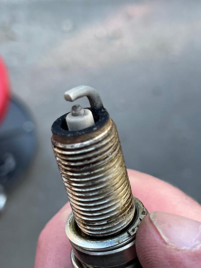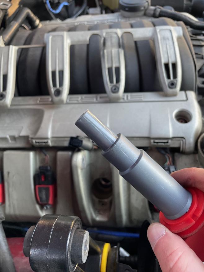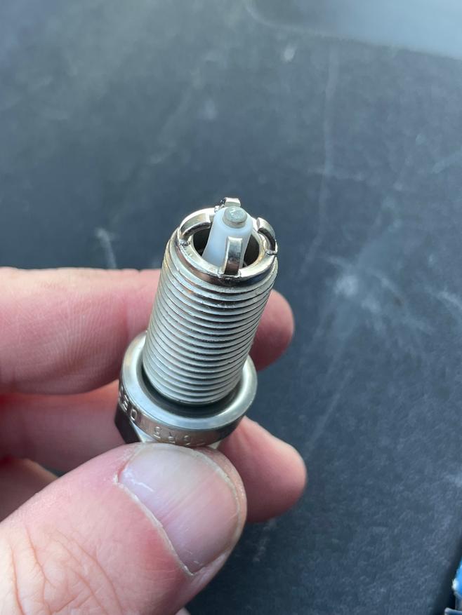Managed to get that one out in one piece. I think the next one came out in two pieces. But, I replaced the coil packs and plugs, and also noted a big difference in the plugs. Here's the old ones versus the new OE ones.
