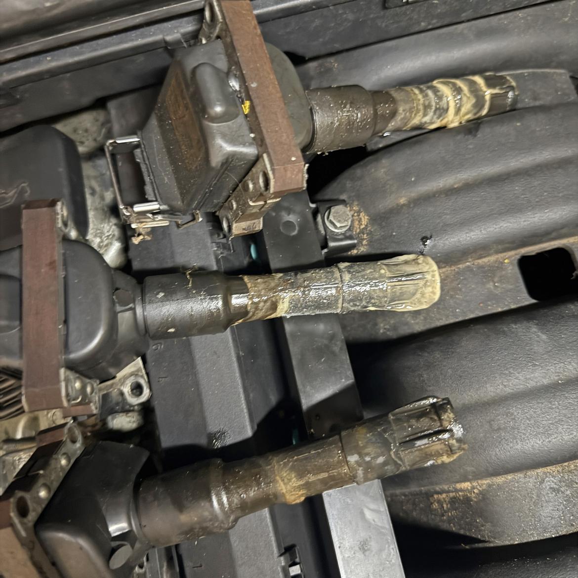 I started pulling spark plugs and ignition coils, and nothing looked great. Every spark plug was black, and most of the ignition coils were wet and gross.
