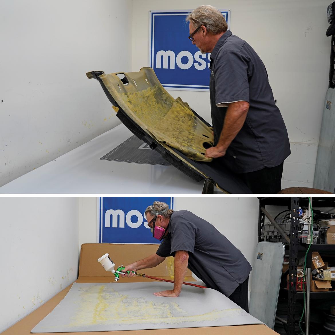 After removing the headliner, we stripped off the old foam-backed fabric. Then we could glue on new material–just $30 from a local supplier.