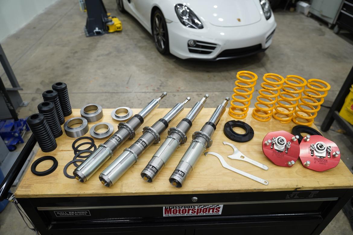 And the price was too good to pass up: At just $3000, these are a screaming deal, and, oops, sorry that’s the price of an Öhlins Road and Track kit for a Mustang. But even with the Porsche tax, a kit for our Cayman retails for $4100. Did we mention how interesting Porsche ownership is? And to be fair, the kit for our car includes some additional hardware to mate the system up to the OEM top hats front and rear.