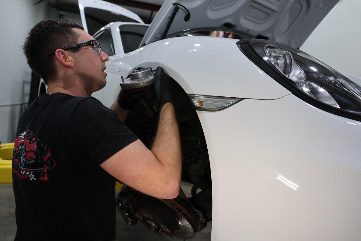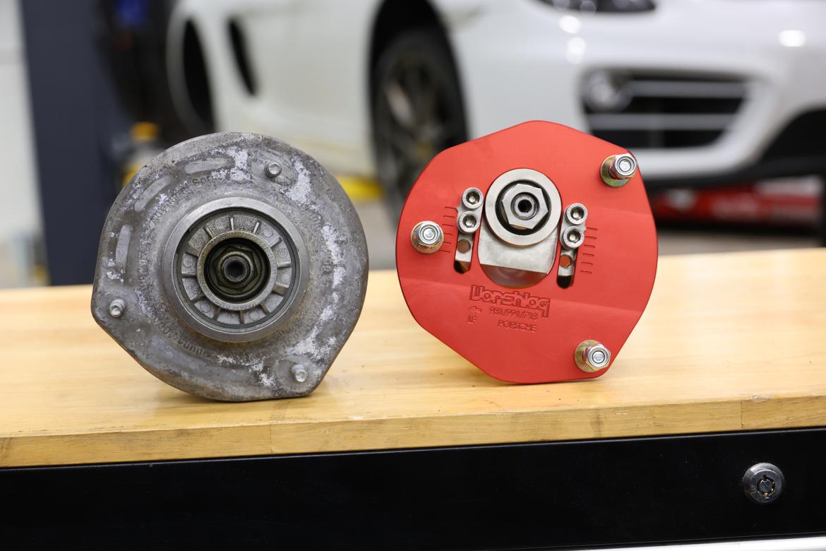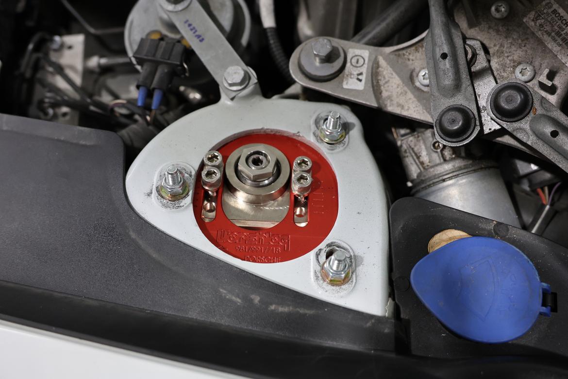 Oh right, top hats. We’ve yet to find a stock car (especially a strut suspension car) that doesn’t benefit on track from more negative camber, so our next call was to Vorshlag Motorsports. We’re big fans of their camber plates and have used them across a zillion projects by now, but, oddly enough, they didn’t have 981 Cayman in their catalog. “But give us a few weeks,” they said, “And we’ll have them.”