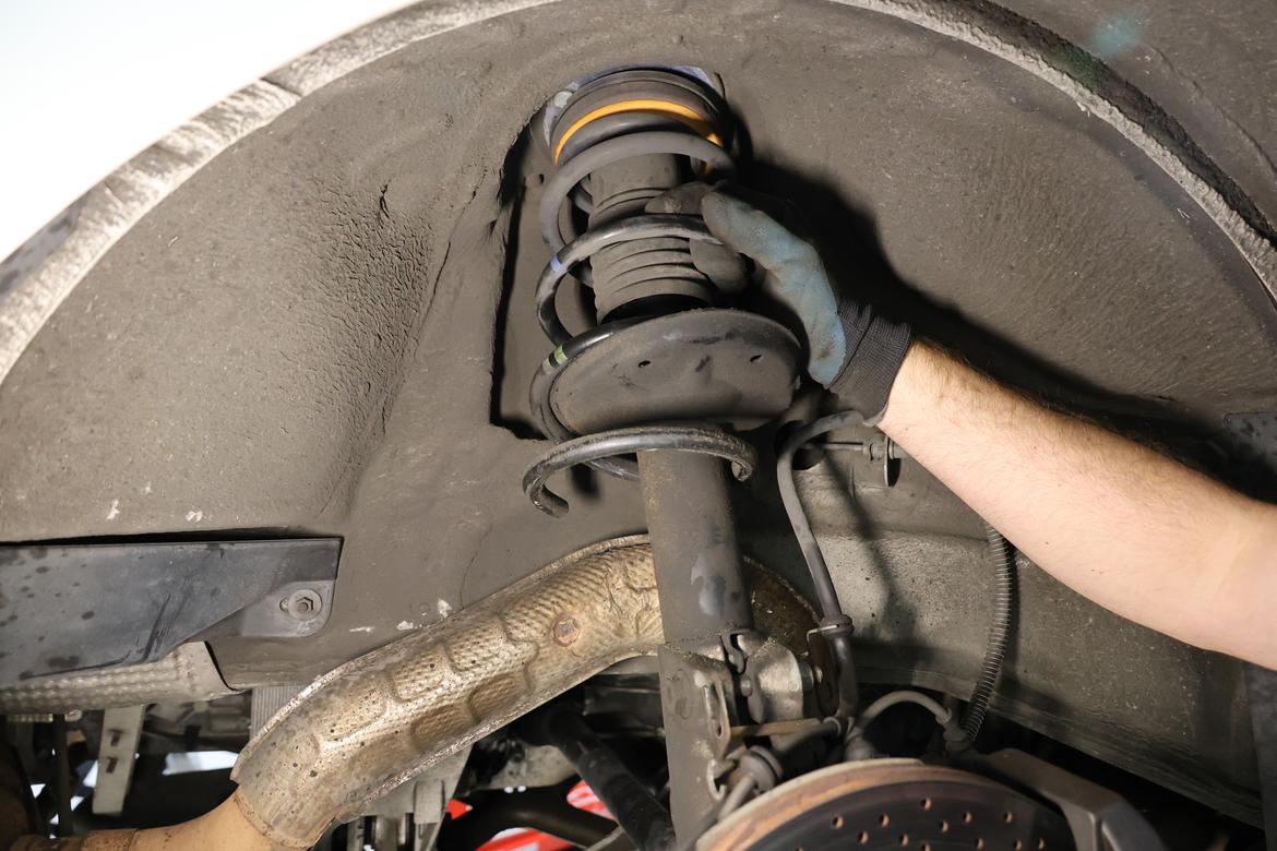 Decisions made and parts acquired, it was time to bolt everything on. And just like the transmission rebuild, we were again shocked at how easy this car is to work on. We didn’t even need a spring compressor in the rear–just some clever threading of the rear spring down and past its lower perch, and the stock suspension came right off the car. Shoutout to the GRM forum for demonstrating that trick for us. Then, the Öhlins setup nearly installed itself, though we got creative with the damping adjustment knob to help compress the assemblies and hold them for a few seconds while we snuck them under the fenders.