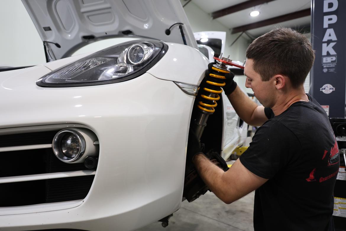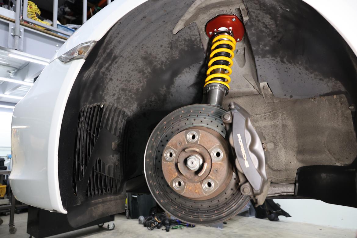 If our wallets were going to bleed, we figured, we might as well upgrade. Spending $2500-plus for a set of sport springs and fixed-perch aftermarket struts didn’t sound reasonable, so instead we kept scrolling to the coil-over category. Adjustable spring perches would let us dial in the exact ride height (and more importantly, exact rake) we wanted, and switch the car from requiring weirdly sized Porsche springs to requiring common aftermarket sizes that we already had on the shelf. We’d be able to save some weight, too.