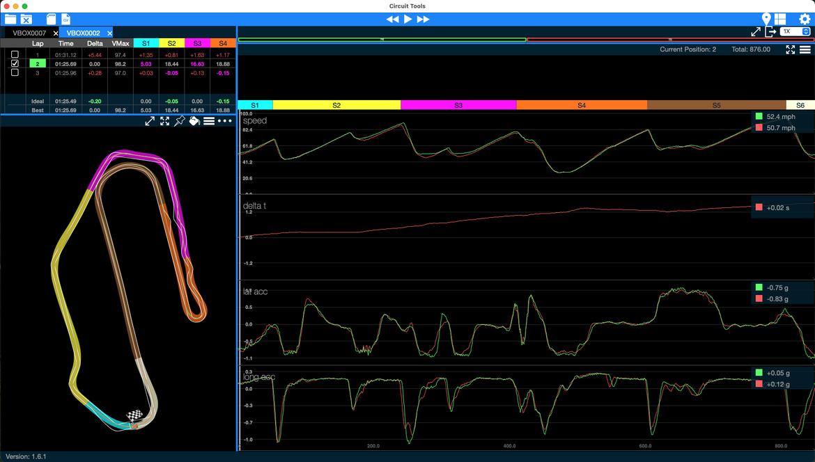 Looking at the VBox data, if we examine the Delta T graph, which shows how much time is being gained or lost by our two highlighted laps–red for stock suspension with BFGoodrich Phenom tires and green for Koni coil-overs with BFGoodrich Phenom tires–we can see that the Konis saved time through almost the entire lap.