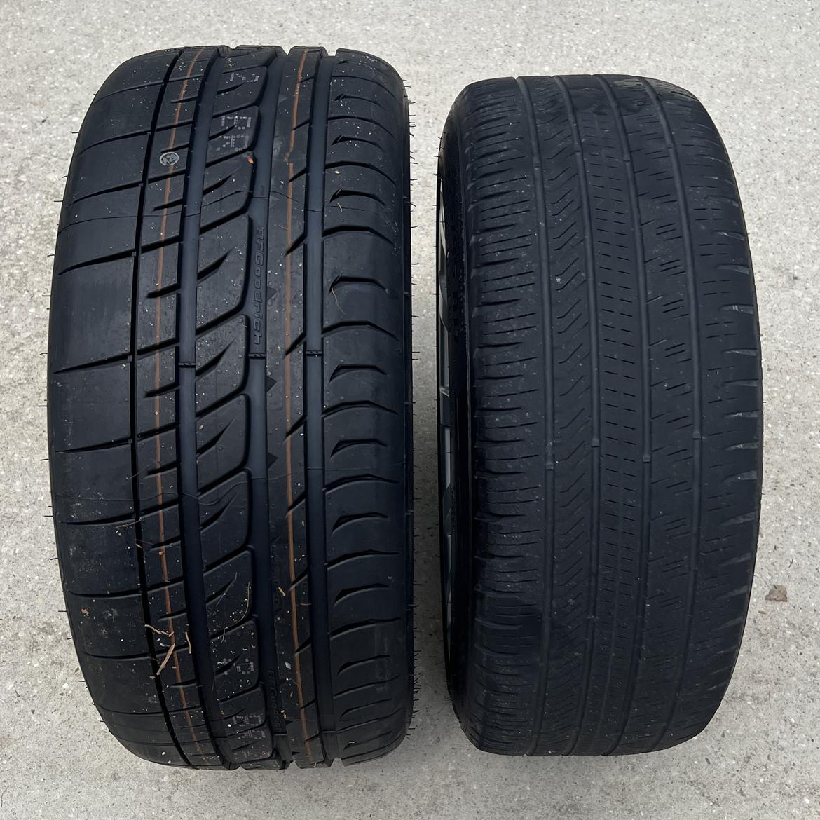 Our new setup, an 18x9-inch TA5R wheel wrapped in a 245/40R18 BFGoodrich g-Force Phenom T/A tire (left) vs. the old stock setup (right).