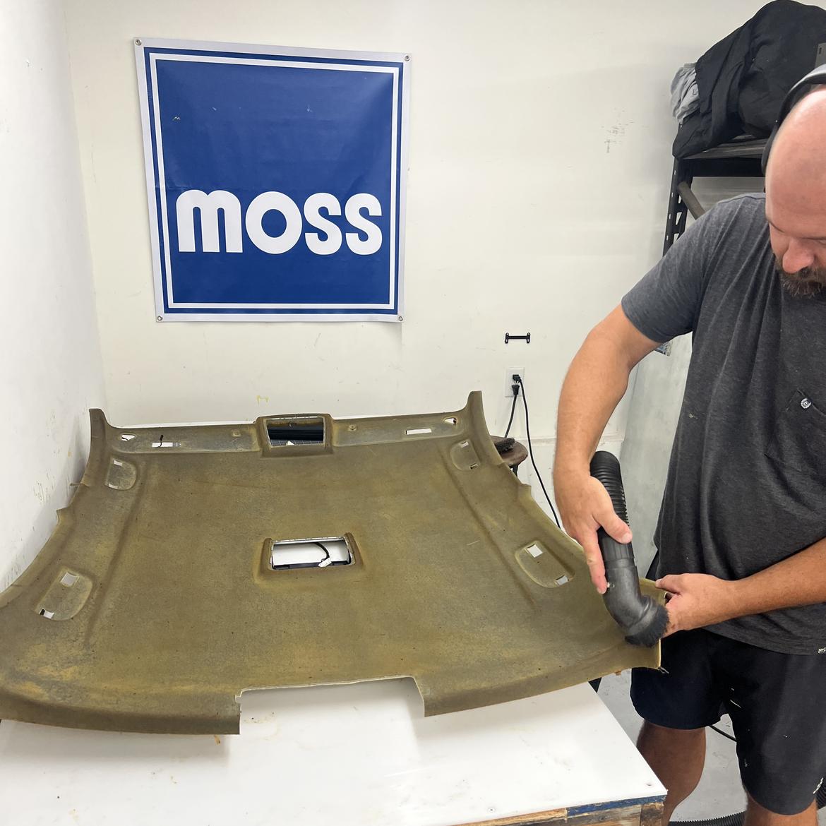 Step 1: After removing any sun visors, grab handles and other things that help retain the fabric, pull the entire headliner out of the car–it usually wiggles through one of the doors at some nearly impossible-to-figure-out angle. Don’t break any clips, and don’t forget how it goes back together. (Your cell phone camera and a tray for those clips are your friends to keep things organized.)