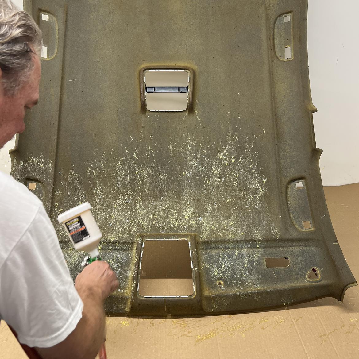 Step 8: Once dry, you can work the new headliner into place. A roller and strong hands will help. Once the two glued surfaces touch each other, it is darned near impossible to lift the material without ruining your new headliner.