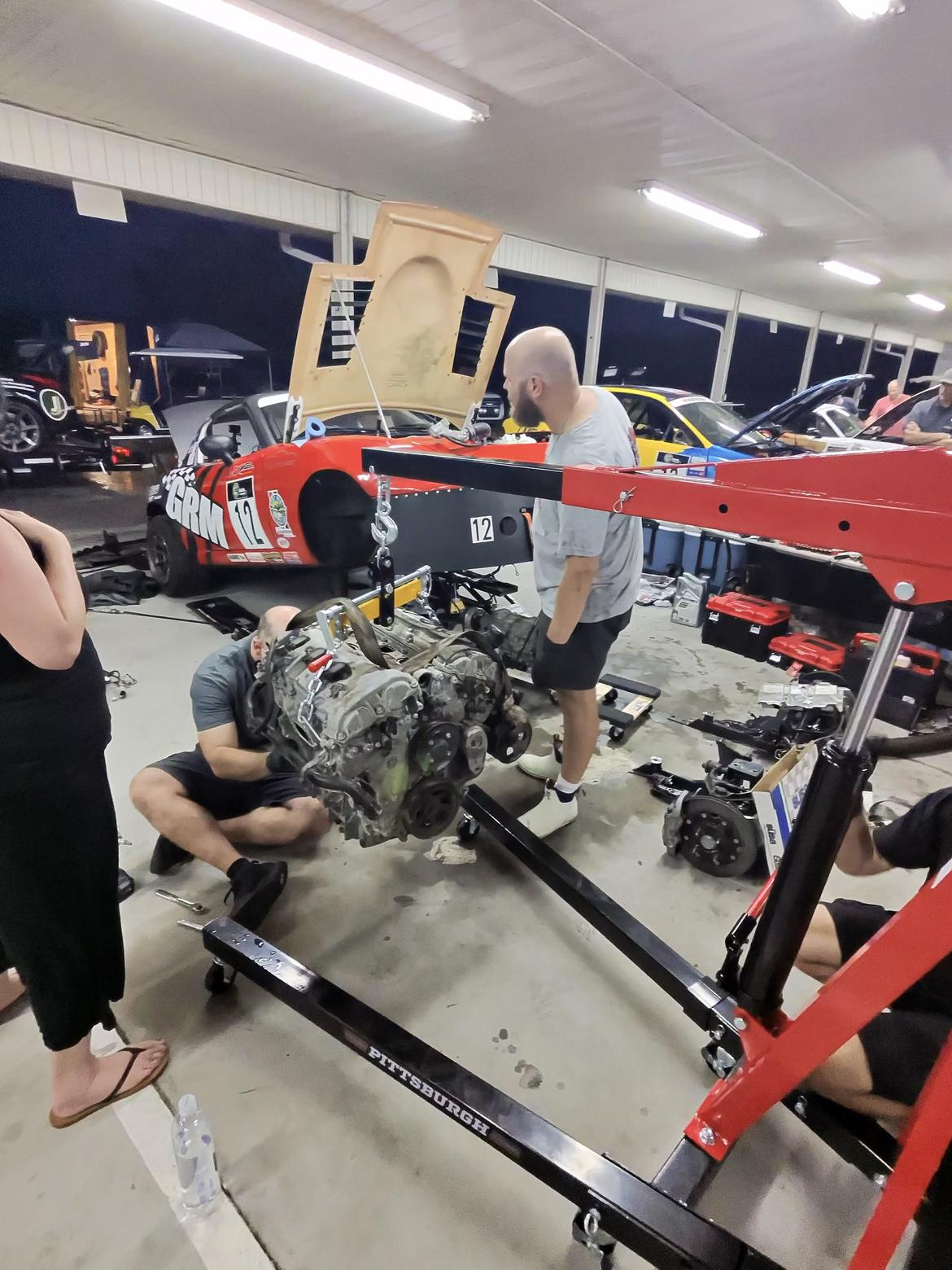 I'm not sure what's braver here: the midnight engine swap (been there), or walking around an active race garage in flip-flops (Brock Yates Jr. excepted).